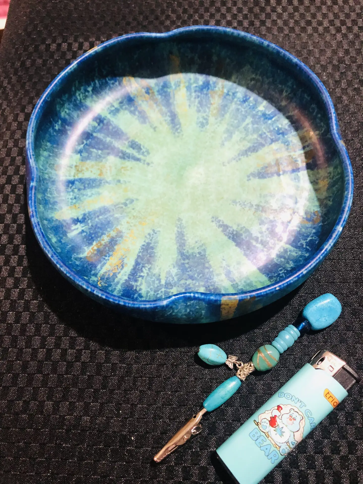 Vintage pottery bowl and turquoise gem clip lighter set